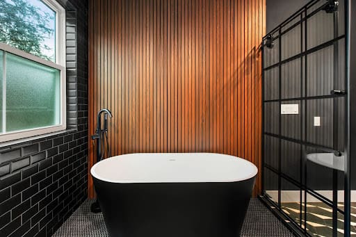 Turning the corner, you’ll find a gorgeous shower room featuring a matte black freestanding tub with a contemporary floor-mounted tub filler, set against a wood slat accent wall that perfectly ties in with the vanity. The dual retrofit thermostatic shower systems, complete with a custom LED-lit shower niche, make this space as functional as it is beautiful. The black beveled ceramic subway tile surround wraps the shower room, contrasting elegantly with the matte porcelain penny tile shower floor. A frameless sliding glass shower door completes the space, seamlessly separating the shower area from the rest of the bathroom.