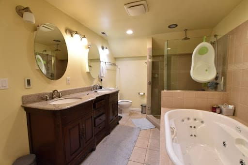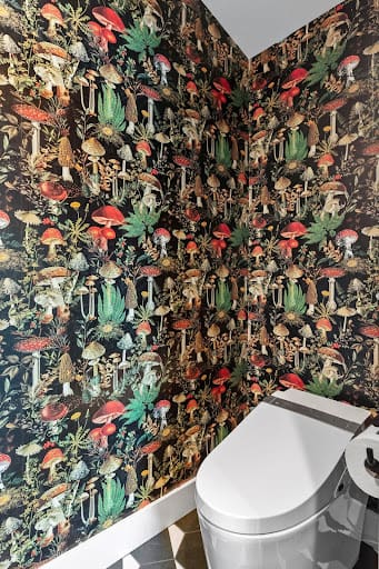 And let’s not forget the details—porcelain hex tile flooring with a state-of-the-art in-floor heating system, plus a separate water closet featuring antique mushroom wallpaper for a pop of character. Topping it all off? A luxurious auto-open, auto-flush toilet with a built-in bidet for next-level comfort.