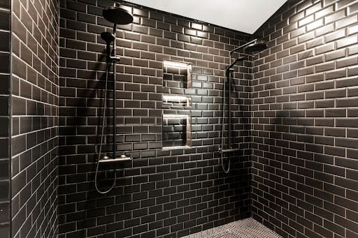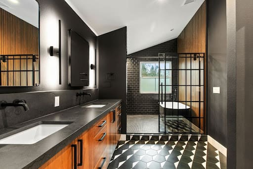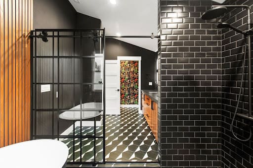 This ensuite is a showstopper, blending bold design, industrial touches, and modern elegance.