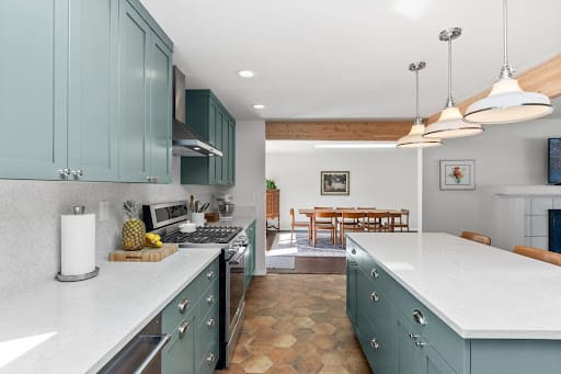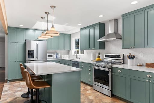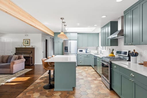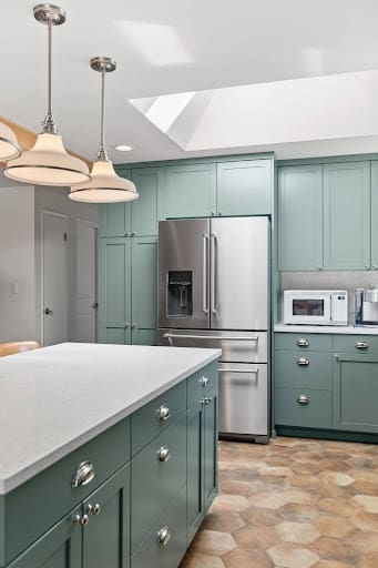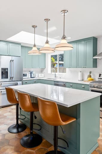 This kitchen remodel was made possible by the incredible MacCoy Home Solutions crew! By removing the wall and built-in breakfast nook between the kitchen and living room, we created an inviting open concept layout perfect for gathering and entertaining. We also relocated the backyard access, replacing the slider door in the kitchen with a single door in the dining room, which opened up even more valuable storage space. This reconfiguration allowed us to introduce a large island with bar seating, all beautifully framed by sage green painted maple cabinets and polished Viatera Cirrus quartz countertops that carry seamlessly up the wall as a statement-making backsplash. The bright, airy design is completed with polished nickel hardware and Quoizel Grant wide dome pendants, while rich Italian Terre Etrusche porcelain hex tile grounds the space and brings in warmth and personality.